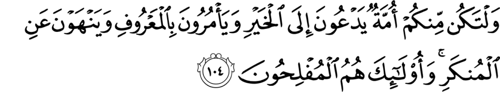 ‘En laat er uit jullie een groep voortkomen die uitnodigt tot het goede en oproept tot deugdelijkheid en (die) het verwerpelijke verbiedt, en zij zijn degenen die de welslagenden zijn.’